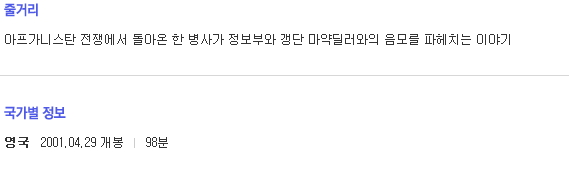 ☆ 줄거리 : 아프가니스탄 전쟁에 참전했던 군인이 마약상과 정보기관이 연루된 음모를 파헤친다.