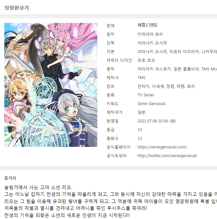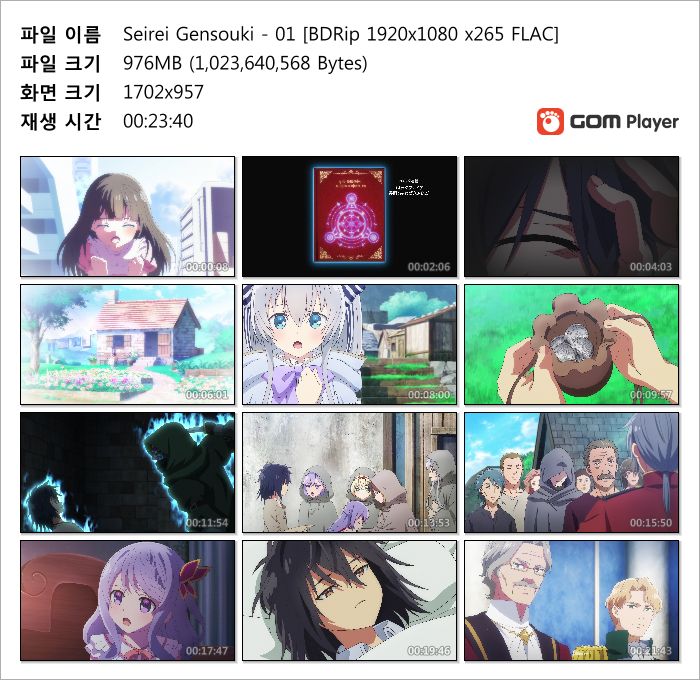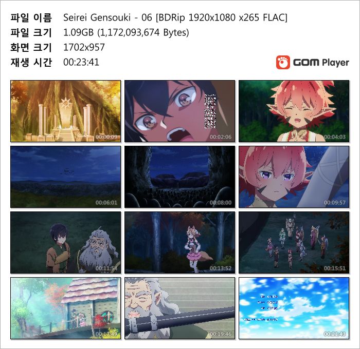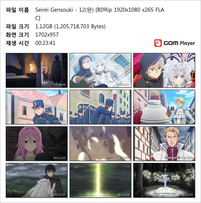 | Seirei Gensouki - 12(완) [BDRip 1920x1080 x265 FLAC].mkv | 1.1 G | MKV | 00:23:41 | 1920x1080 |