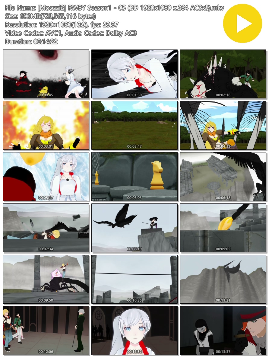 | [Moozzi2] RWBY Season1 - 05 (BD 1920x1080 x.264 AC3x3).mkv | 690 M | MKV | 00:14:22 | 1920x1080 |