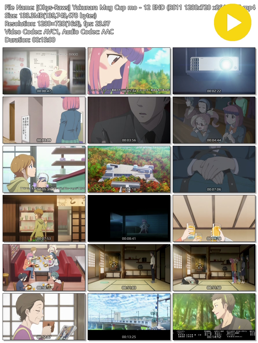 | [Ohys-Raws] Yakunara Mug Cup mo - 12 END (BS11 1280x720 x264 AAC).mp4 | 133.3 M | MP4 | 00:15:00 | 1280x720 |