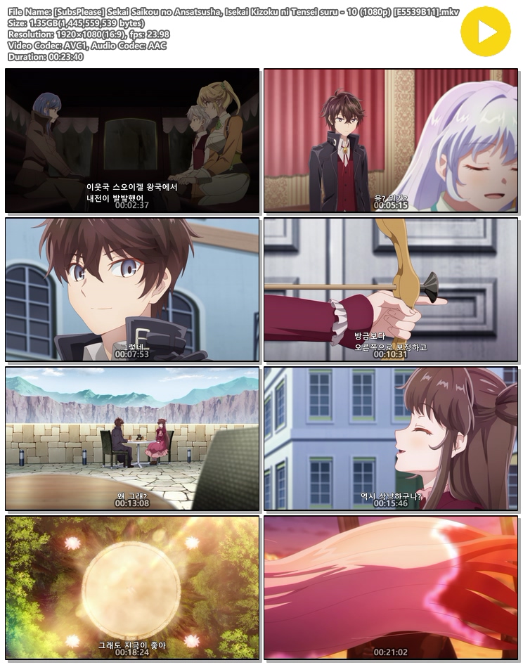 | [SubsPlease] Sekai Saikou no Ansatsusha, Isekai Kizoku ni Tensei suru - 10 (1080p) [E5539B11].mkv | 1.3 G | MKV | 00:23:40 | 1920x1080 |