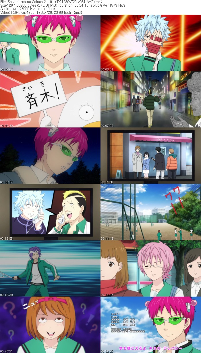 | Saiki Kusuo no Sainan 2 - 01 (TX 1280x720 x264 AAC).mp4 | 273.9 M | MP4 | - | 1280x720 |