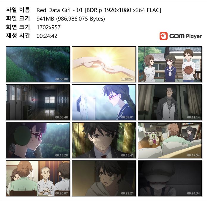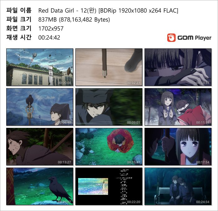 | Red Data Girl - 12(완) [BDRip 1920x1080 x264 FLAC].mkv | 837.5 M | MKV | 00:24:42 | 1920x1080 |