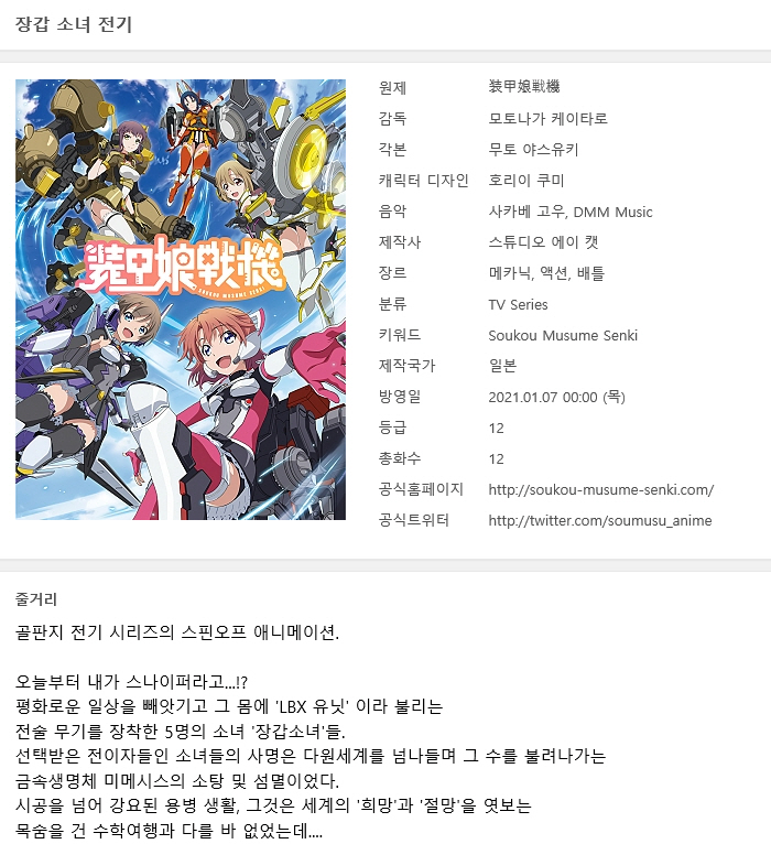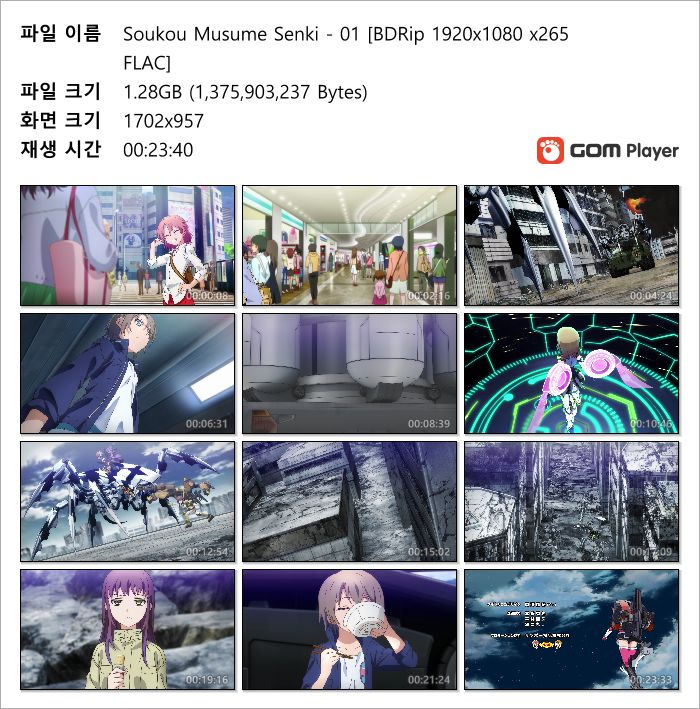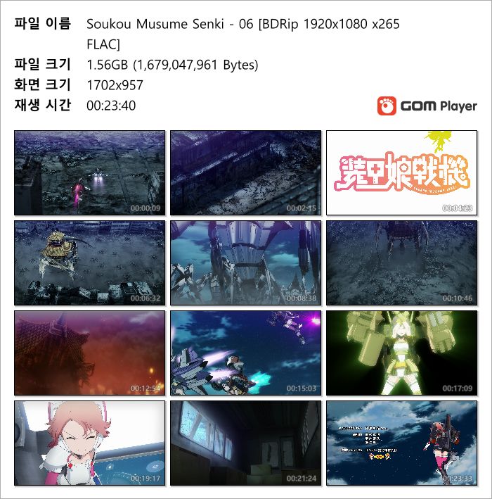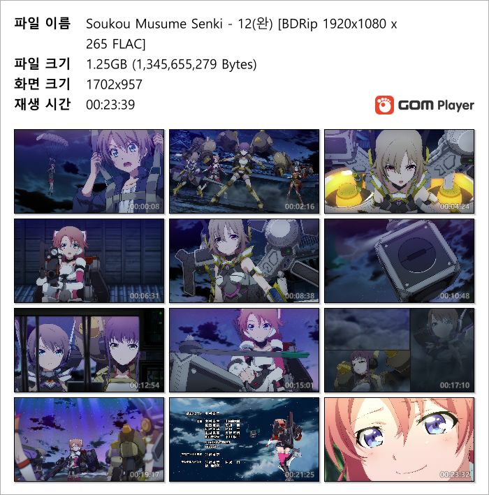 | Soukou Musume Senki - 12(완) [BDRip 1920x1080 x265 FLAC].mkv | 1.3 G | MKV | 00:23:39 | 1920x1080 |