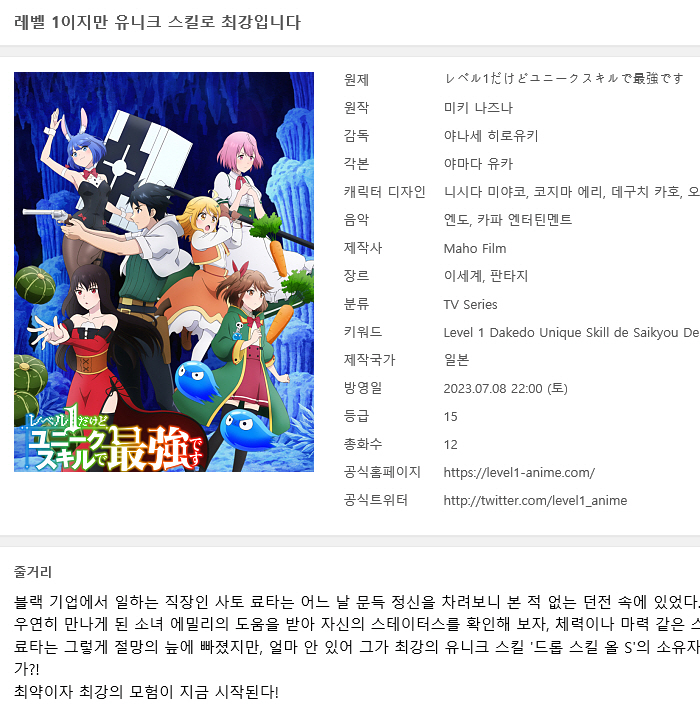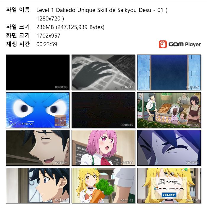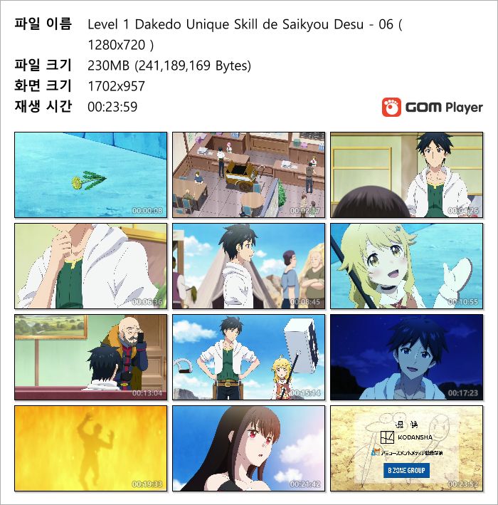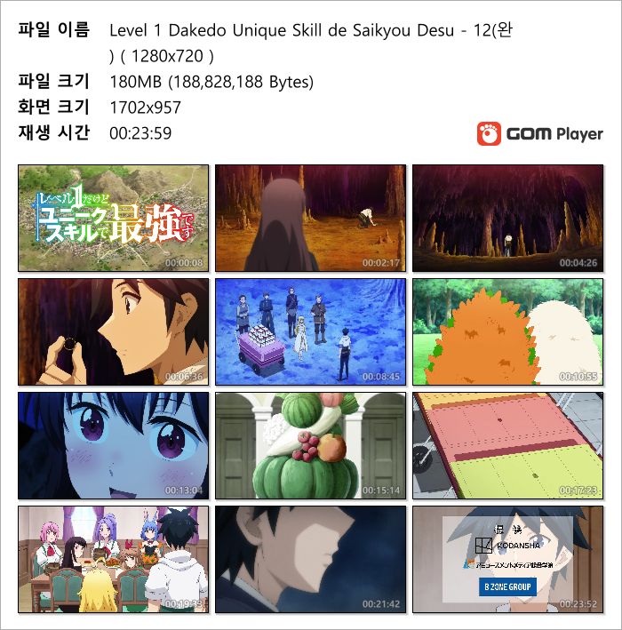 | Level 1 Dakedo Unique Skill de Saikyou Desu - 12(완) ( 1280x720 ).mp4 | 180.1 M | MP4 | 00:23:59 | 1280x720 |