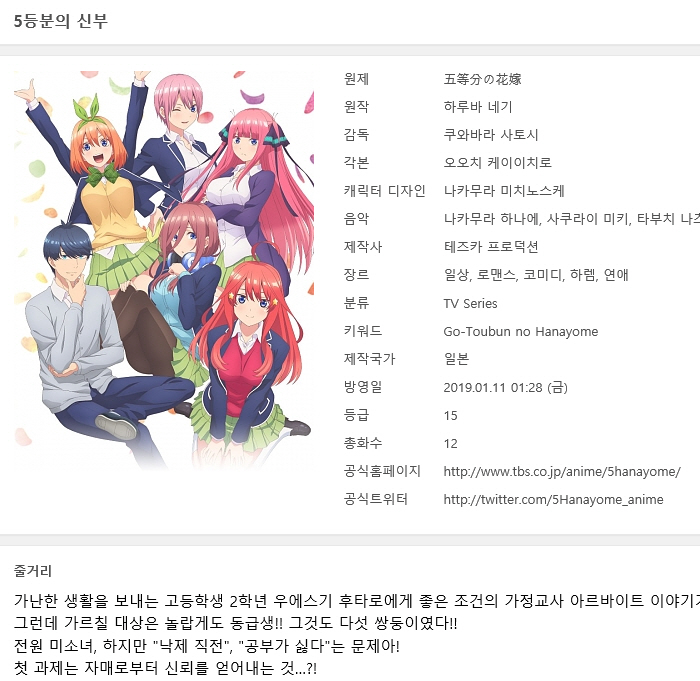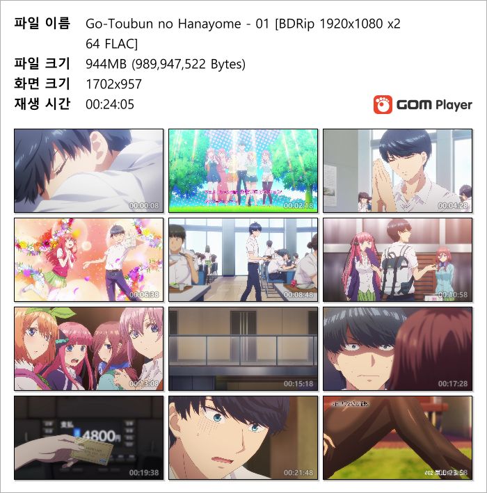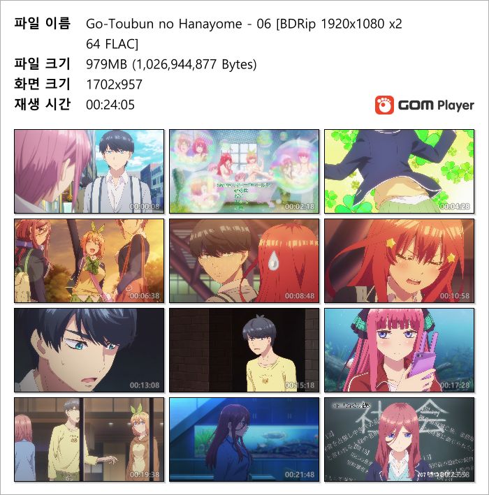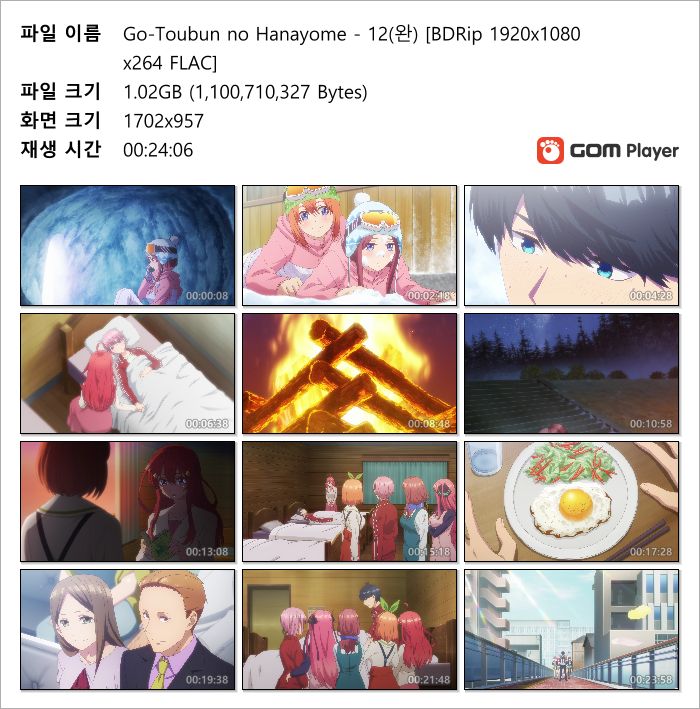 | Go-Toubun no Hanayome - 12(완) [BDRip 1920x1080 x264 FLAC].mkv | 1 G | MKV | 00:24:06 | 1920x1080 |