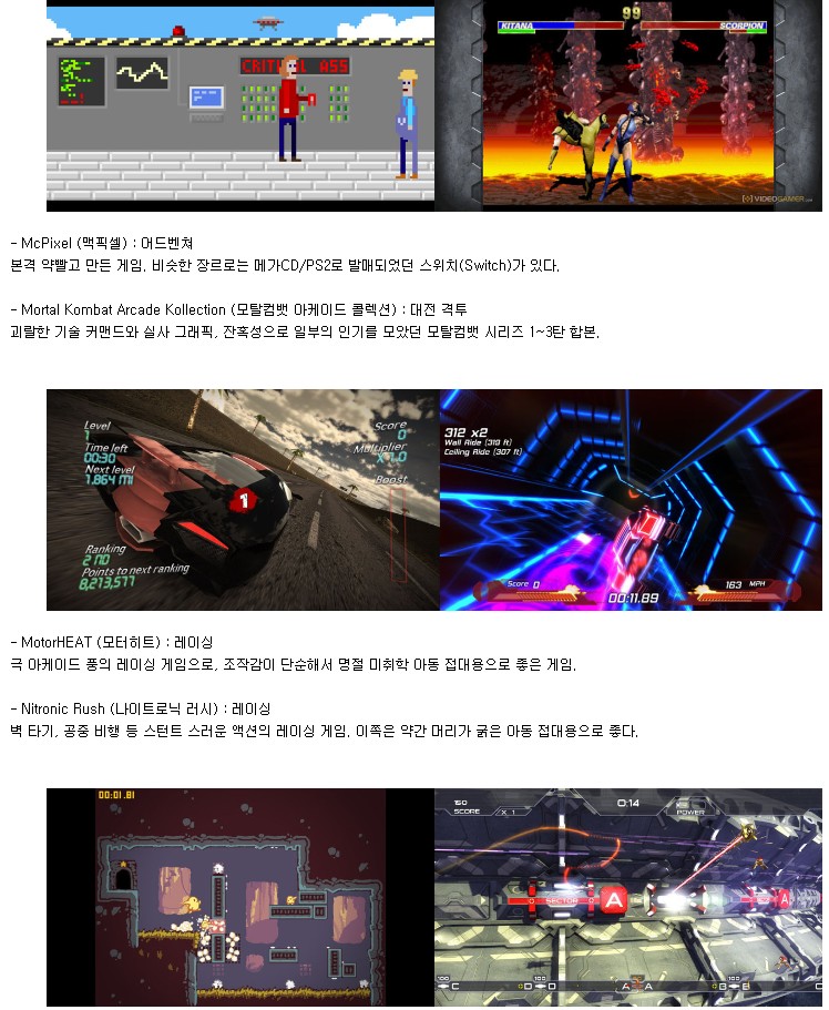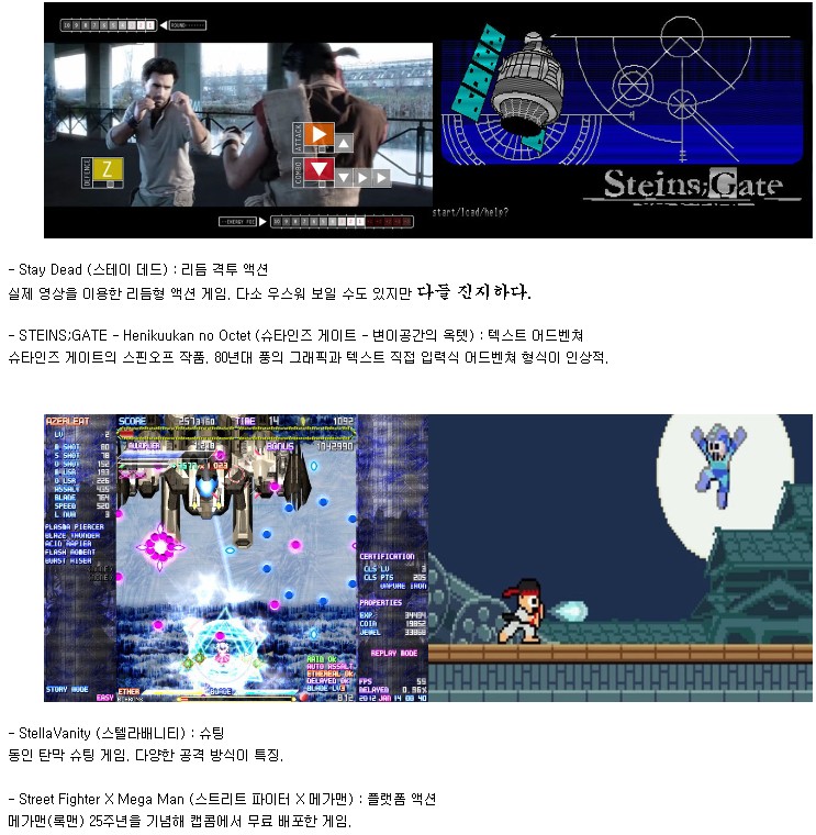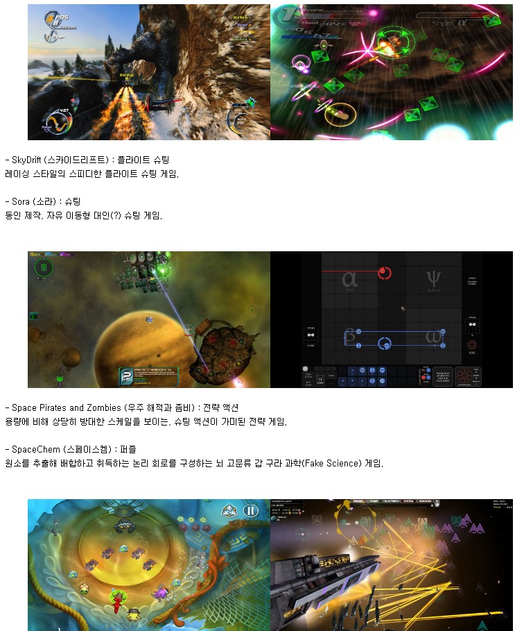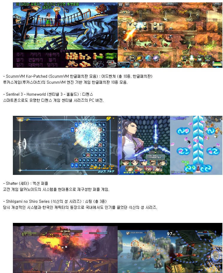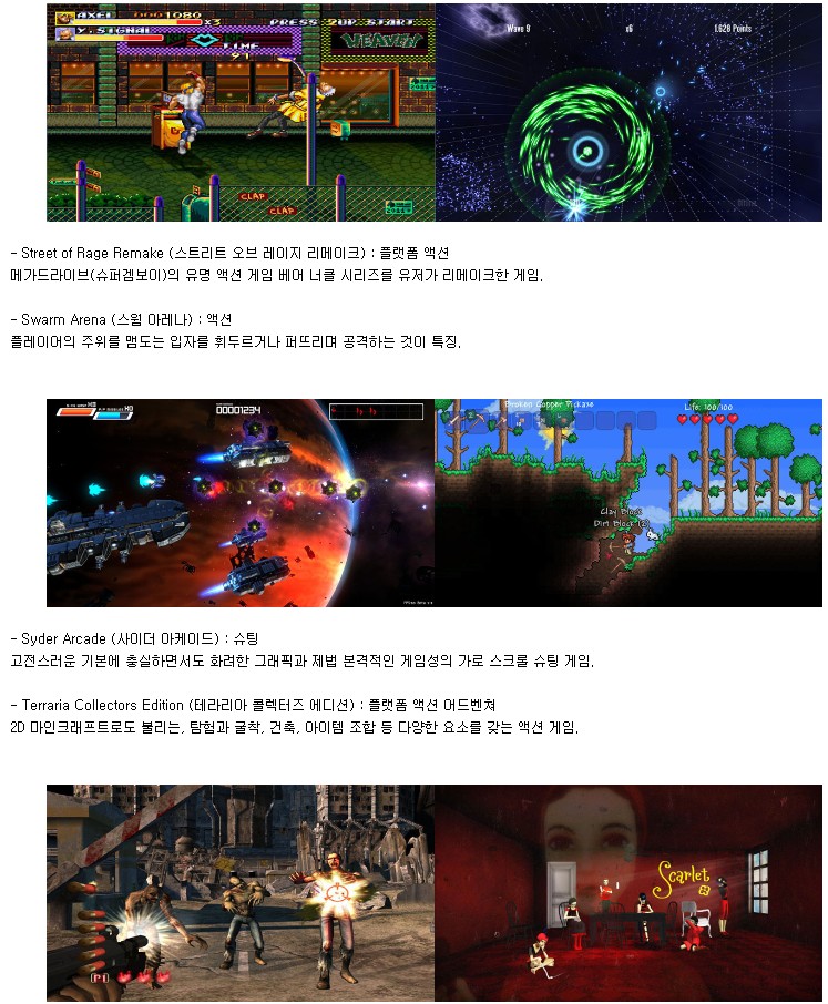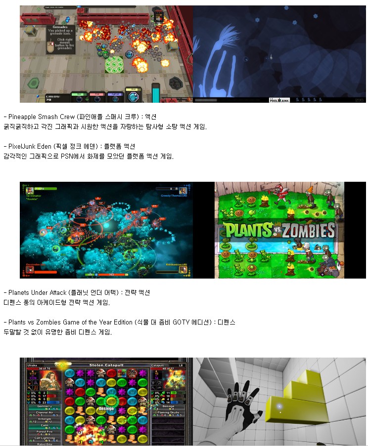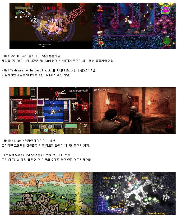 3SwitcheD (3스위치D) : 매치 퍼즐 8-Bit Commando (8비트 코만도) : 플랫폼 액션 A Virus Named TOM (바이러스 네임드 탐) : 퍼즐 Adventure Apes and the Mayan Mystery (어드벤처 에이프 앤 마야 미스테리) : 플랫폼 액션 Akatsuki Blitzkampf (아카츠키 전광전기) : 대전 격투 ALLTYNEX Second (알티넥스 세컨드) : 슈팅 Analogue - A Hate Story (아날로그 - 헤이트 스토리) : 어드벤쳐 Anomaly - Warzone Earth (어노멀리 - 워존 어스) : 전략 디펜스 Another World - 15th Anniversary Edition (어나더 월드 15주년 기념판) : 어드벤쳐 ARES - Extinction Agenda (아레스 - 익스팅션 아젠다) : 플랫폼 액션 Arvoch Alliance (아복 얼라이언스) : 플라이트 슈팅 Auditorium (오디토리움) : 음악 퍼즐 AVSEQ (AVSEQ) : 음악 퍼즐 Awesomenauts (어썸노츠) : 플렛폼 액션 Babel Rising (바벨 라이징) : 전략 액션 Bang Bang Racing (뱅뱅 레이싱) : 캐주얼 레이싱 BasketBelle (바스켓벨) : 퍼즐 액션 Beat Hazard Ultra (비트 해저드 울트라) : 음악 슈팅 Bejeweled 3 (비주얼드 3) : 매치 퍼즐 Bionic Commando Rearmed (바이오닉 코만도 리암드) : 플랫폼 액션 BIT.TRIP CORE (비트 트립 코어) : 리듬 슈팅 Black Market (블랙 마켓) : 전략 Blue Sabers (블루 세이버) : 슈팅 Blue Sabers - Operation Orbital Hammer (블루 세이버 - 오퍼레이션 오비탈 해머) : 슈팅 Braid (브레이드) : 플랫폼 액션 (한글판) Bust-n-Rush (버스트 앤 러시) : 액션 Cell HD - emergence (셀 HD 이머전스) : 퍼즐 슈팅 Chantelise (JP, EN) (샹텔리제) : 액션 롤플레잉 (일어판, 영어판) Cloudphobia (클라우드포비아) : 슈팅 Colour Bind (컬러 블라인드) : 퍼즐 Cortex Command (코텍스 커맨드) : 전략 액션 Crimzon Clover (크림즌 클로버) : 슈팅 Critical Mass (크리티컬 매스) : 매치 퍼즐 Critter Crunch (크리터 크런치) : 매치 퍼즐 Cubemen (큐브멘) : 전략 디펜스 CYPHER - Cyberpunk Text Adventure (사이퍼 - 사이버펑크 어드벤쳐) : 텍스트 어드벤쳐 Dead Block (데드 블럭) : 3인칭 액션 디펜스 Deadly 30 (데들리 30) : 플랫폼 액션 Death Rally (데스 랠리) : 액션 레이싱 Death Road (데스 로드) : 레이싱 Dirty Split (더티 스플릿) : 어드벤쳐 (한글패치판) Dong Dong Never Die (동동불사전설) : 대전 격투 Dragonfly (드래곤플라이) : 슈팅 Dungeon Keeper (던전 키퍼) : 전략 Dungeon Keeper 2 (던전 키퍼 2) : 전략 Dustforce (더스트포스) : 플랫폼 액션 Dynamite Jack (다이나마이트 잭) : 액션 어드벤쳐 EDGE (에지) : 퍼즐 ETHER VAPOR Remaster (에텔 바이퍼 리마스터) : 슈팅 Eufloria (유플로리아) : 전략 Evochron Mercenary (에보크론 머시너리) : 플라이트 슈팅 Faster Than Light (FTL - 패스터 댄 라이트) : 전략 Fibrillation (파이브릴레이션) : 1인칭 호러 어드벤쳐 Fractal (프랙탈) : 퍼즐 Frozen Synapse (프로즌 시냅스) : 전략 Galaxy On Fire 2 (갤럭시 온 파이어 2 HD) : 플라이트 슈팅 (한글판) Geometry Wars Retro Evolved (지오메트리 워즈) : 슈팅 Gratuitous Tank Battles (그래티터스 탱크 배틀) : 전략 디펜스 GwangeDash (G완게 대시) : 슈팅 Hack Slash Loot (핵 슬래시 루트) : 롤플레잉 Half-Minute Hero (용사 30) : 액션 롤플레잉 Hell Yeah Wrath of the Dead Rabbit (헬 예아! 데드 래빗의 분노) : 액션 Hotline Miami (핫라인 마이아미) : 액션 I`m Not Alone (아임 낫 얼론) : 3인칭 호러 어드벤쳐 Incredipede (인크레디피드) : 퍼즐 Infinity Danger (인피니티 데인저) : 슈팅 InMomentum (인모멘텀) : 1인칭 액션 Iron Sky Invasion (아이언 스카이 인베이전) : 플라이트 슈팅 Jamestown - Legend of the Lost Colony (제임스타운) : 슈팅 Kutar (쿠타 시리즈) : 액션 퍼즐 La-Mulana (라 물라나) : 플랫폼 액션 Legend of Grimrock (레전드 오브 그림락) : 던전 롤플레잉 Limbo (림보) : 플랫폼 액션 (한글판) Lone Survivor (론 서바이버) : 액션 어드벤쳐 McPixel (맥픽셀) : 어드벤쳐 Mortal Kombat Arcade Kollection (모탈컴뱃 아케이드 콜렉션) : 대전 격투 MotorHEAT (모터히트) : 레이싱 Nitronic Rush (나이트로닉 러시) : 레이싱 Offspring Fling (오프스프링 플링) : 플랫폼 액션 Orbitron - Revolution (오비트론 - 레볼루션) : 슈팅 Pineapple Smash Crew (파인애플 스매시 크루) : 액션 PixelJunk Eden (픽셀 정크 에덴) : 플랫폼 액션 Planets Under Attack (플래닛 언더 어택) : 전략 액션 Plants vs Zombies Game of the Year Edition (식물 대 좀비 GOTY 에디션) : 디펜스 Puzzle Quest Series (퍼즐 퀘스트 시리즈) : 매치 퍼즐 (총 2종) Q.U.B.E (Q.U.B.E) : 1인칭 퍼즐