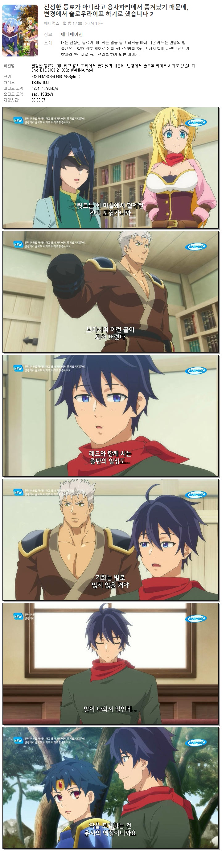 | 진정한 동료가 아니라고 용사 파티에서 쫓겨났기 때문에, 변경에서 슬로우 라이프 하기로 했습니다 2nd.E10.240312.1080p.WANNA.mp4 | 843.6 M | MP4 | 00:23:37 | 1920x1080 |