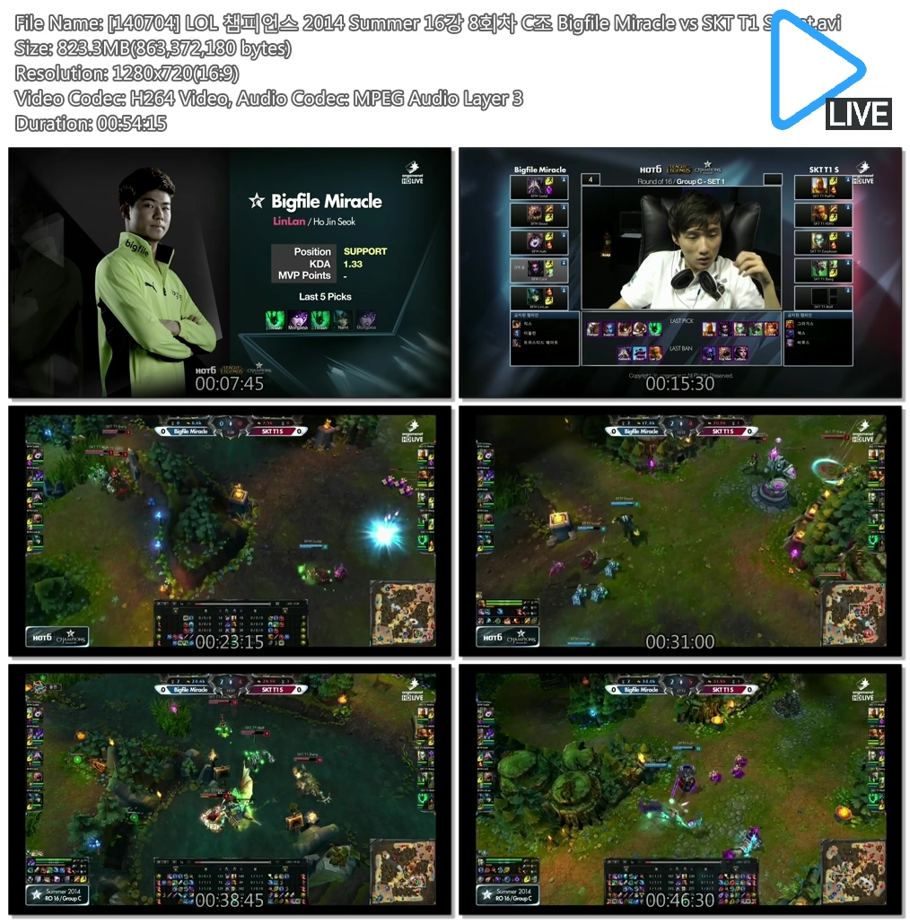 | [140704] LOL 챔피언스 2014 Summer 16강 8회차 C조 Bigfile Miracle vs SKT T1 S 1set.avi | 823.4 M | AVI | - | - |