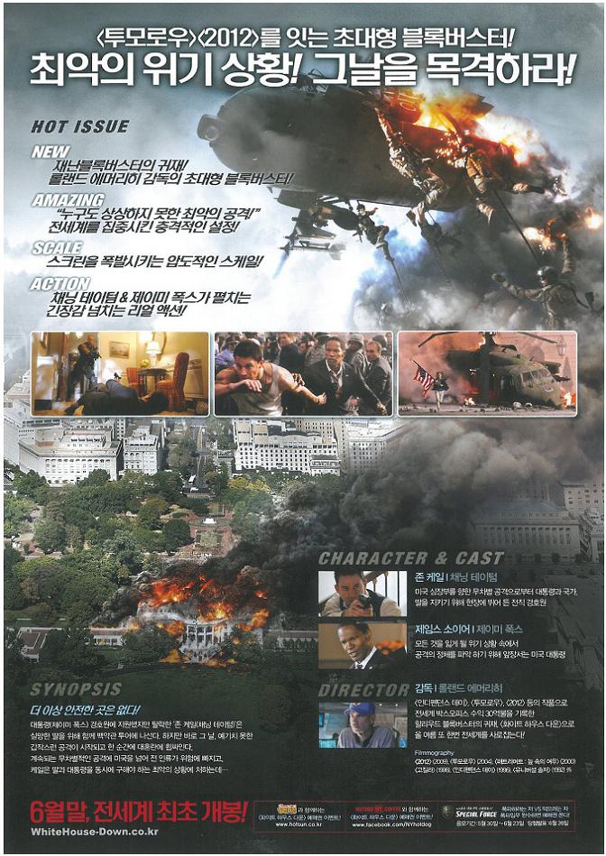 더 이상 안전한 곳은 없다! 대통령(제이미 폭스) 경호원에 지원했지만 탈락한 ‘존 케일(채닝 테이텀)’은 실망한 딸을 위해 함께 백악관 투어에 나선다. 하지만 바로 그 날, 예기치 못한 갑작스런 공격이 시작되고 한 순간에 대혼란에 휩싸인다. 계속되는 무차별적인 공격에 미국을 넘어 전 인류가 위험에 빠지고, 케일은 딸과 대통령을 동시에 구해야 하는 최악의 상황에 처하는데… |