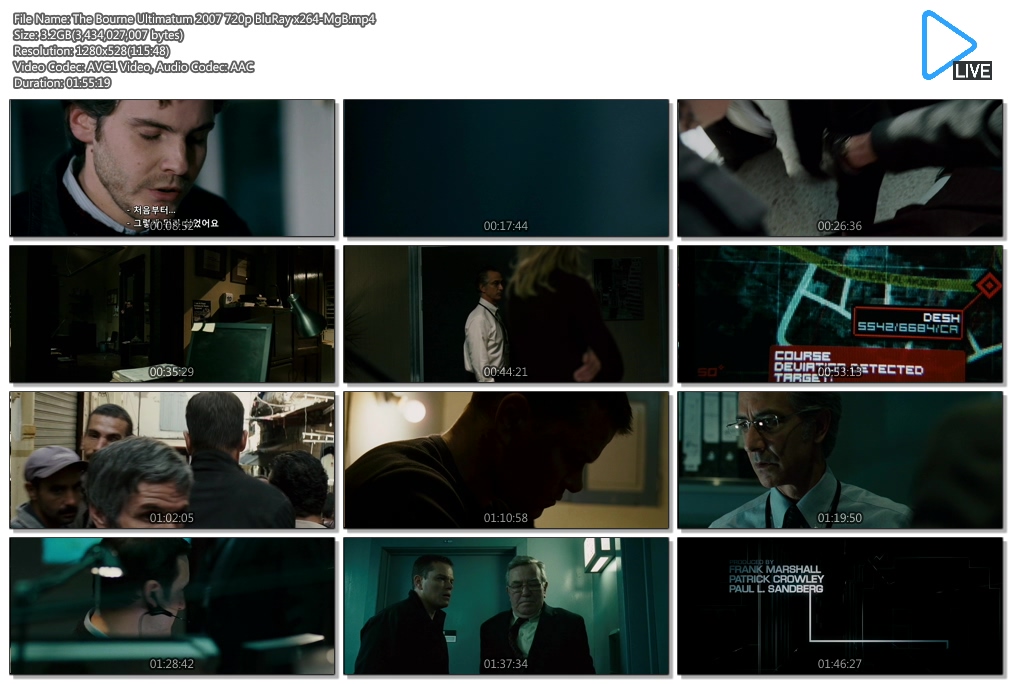 | The Bourne Ultimatum 2007 720p BluRay x264-MgB.mp4 | 3.2 G | MP4 | - | 1280x720 |