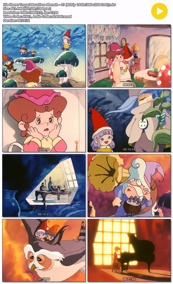 | Tongari Boushi no Memole - 15 [BDRip 1440x1080 x264 FLAC].mkv | 652.6 M | MKV | 00:24:30 | 1440x1080 |