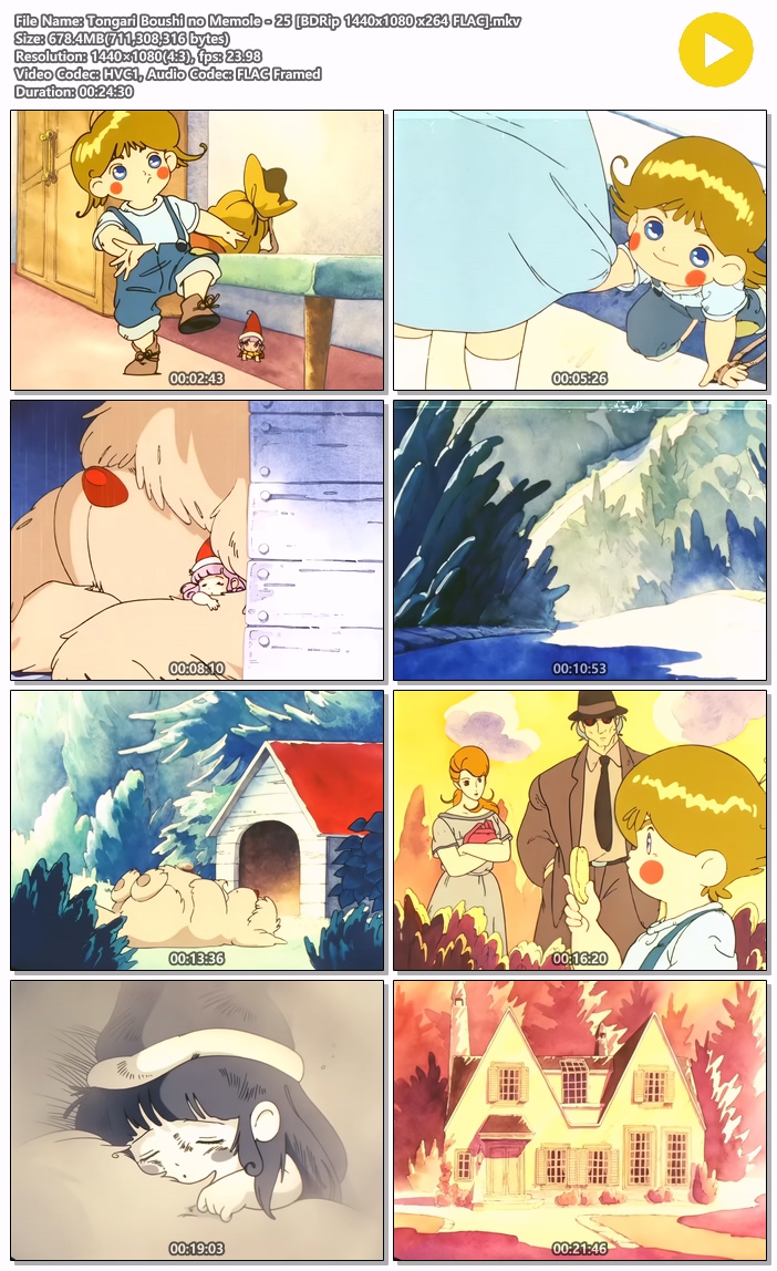 | Tongari Boushi no Memole - 26 [BDRip 1440x1080 x264 FLAC].mkv | 627.5 M | MKV | 00:24:29 | 1440x1080 |