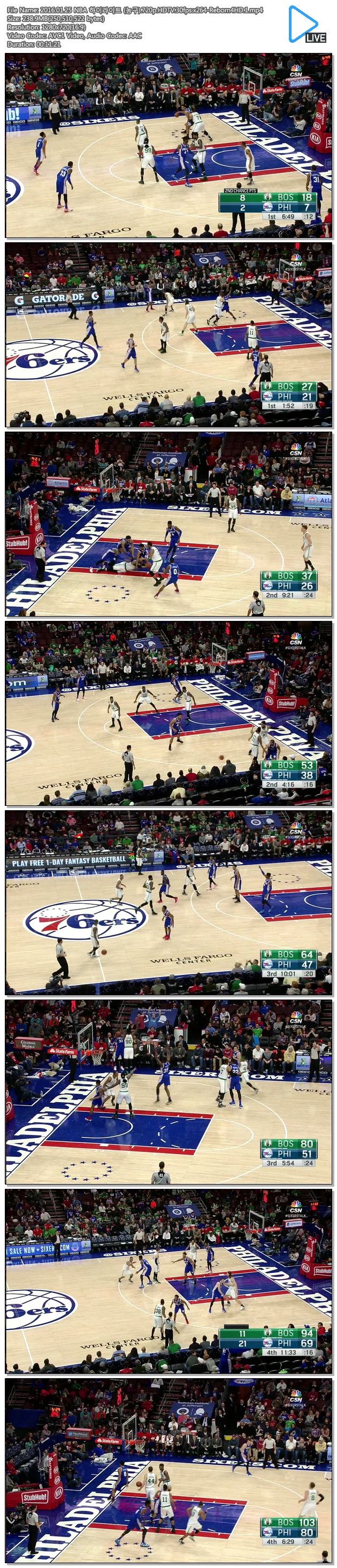 | 2016.01.25 NBA 하이라이트 (농구).720p.HDTV.30fps.x264-Reborn4HD.1.mp4 | 238.9 M | MP4 | 00:11:21 | 1280x720 |