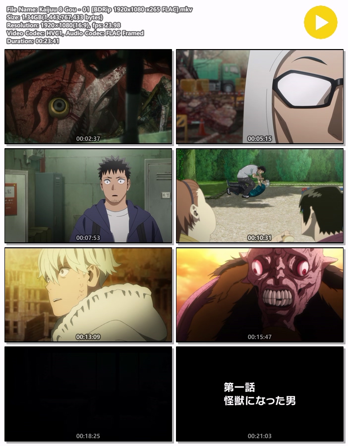 | Kaijuu 8 Gou - 01 [BDRip 1920x1080 x265 FLAC].mkv | 1.3 G | MKV | 00:23:41 | 1920x1080 |