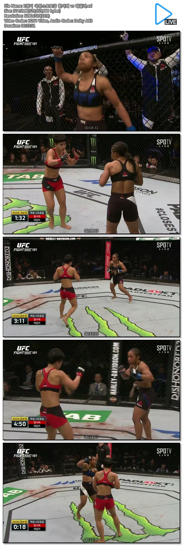 | 1경기 여성스트로급 함서희 vs 테일러.avi | 504.5 M | AVI | 00:27:11 | 1280x720 |