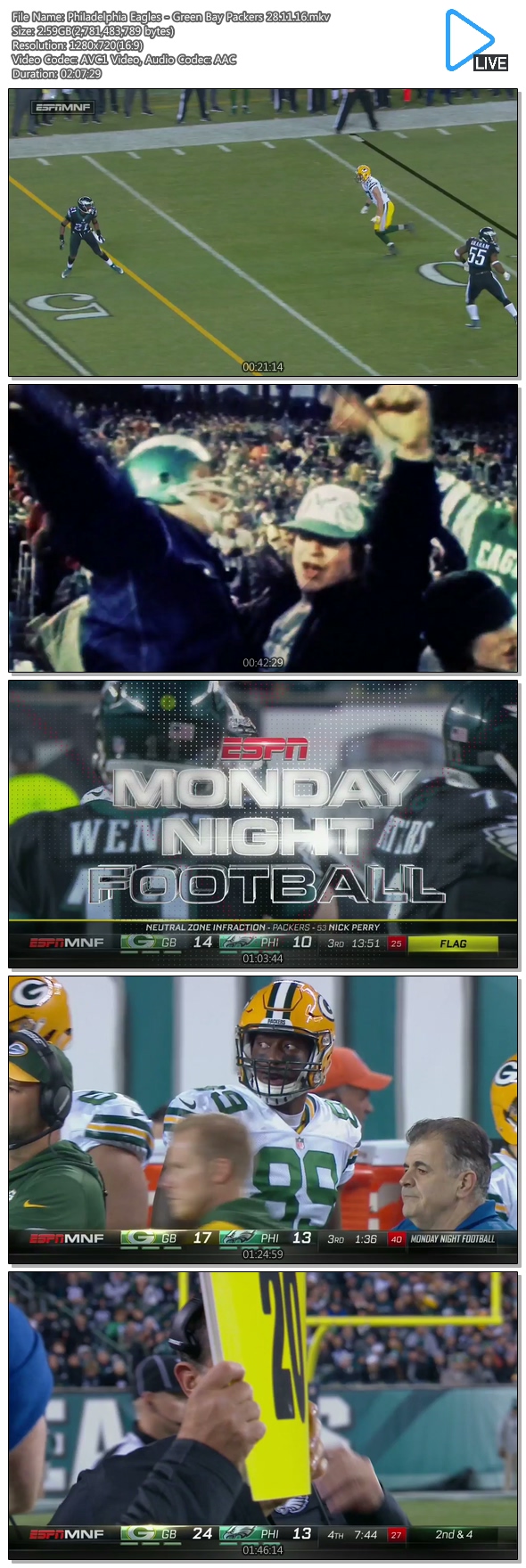 Philadelphia Eagles - Green Bay Packers 28.11.16.mkv 2.6 G MKV 02:07:29 1280x720