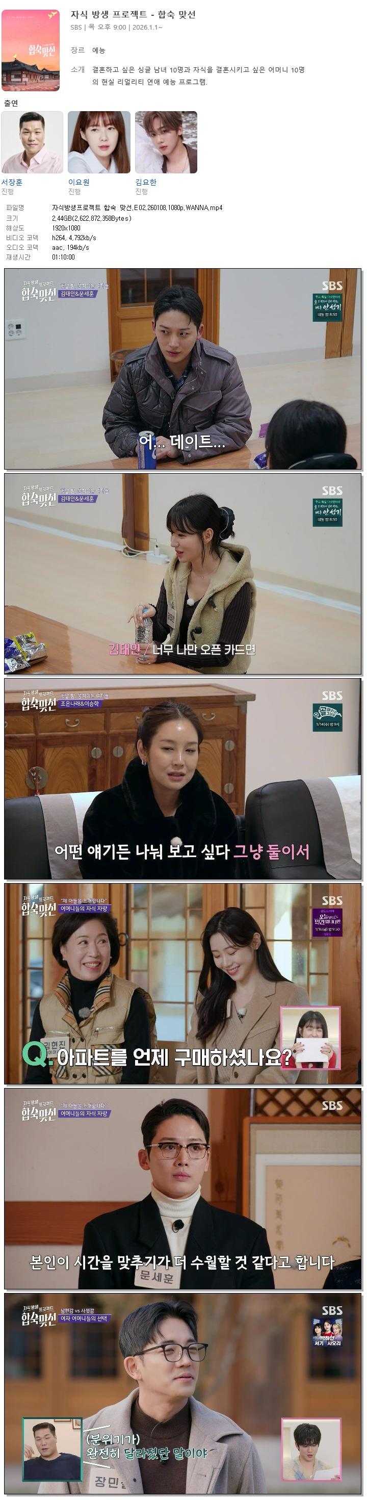 [SBS] 자식방생프로젝트 합숙 맞선.E02.260108.1080p.WANNA[서장훈, 이요원]