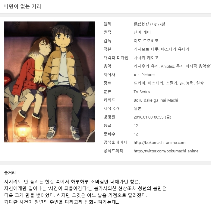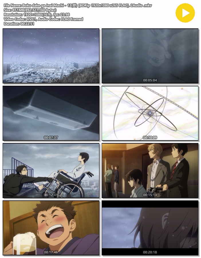 | Boku dake ga Inai Machi - 12(완) [BDRip 1920x1080 x265 FLAC]. 2Audio .mkv | 851 M | MKV | 00:22:51 | 1920x1080 |