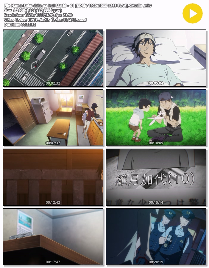| Boku dake ga Inai Machi - 01 [BDRip 1920x1080 x265 FLAC]. 2Audio .mkv | 1.2 G | MKV | 00:22:52 | 1920x1080 |