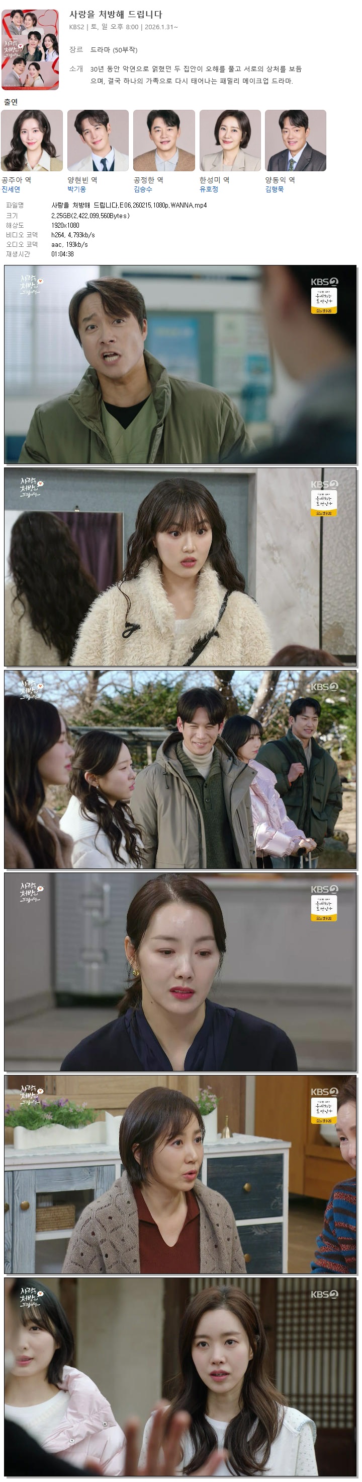 [KBS2] 사랑을 처방해 드립니다.E06.260215.1080p.WANNA[진세연, 박기웅].mp4 2.3 G MP4 01:04:38 1920x1080