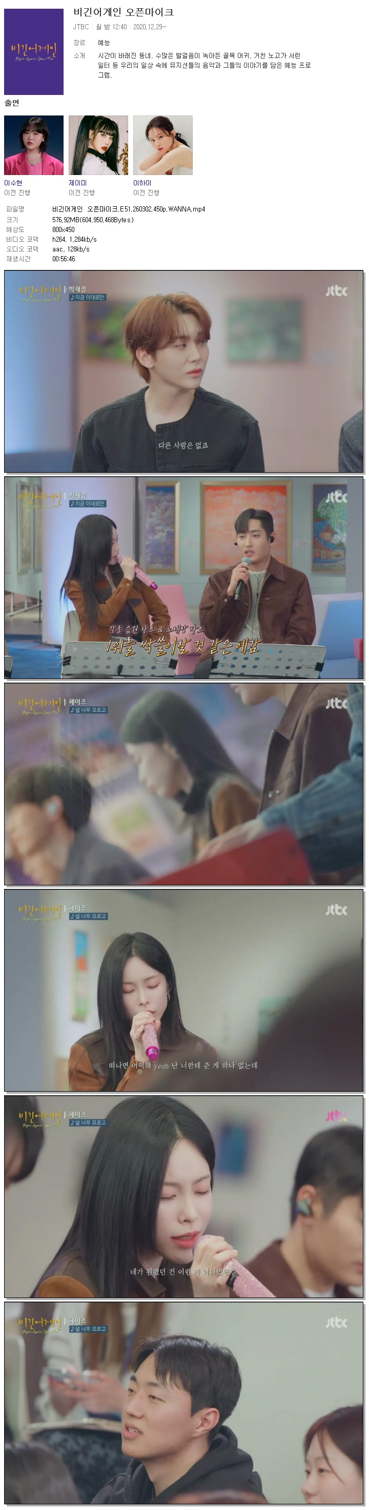 [JTBC] 비긴어게인 오픈마이크.E51.260302.450p.WANNA[서은광, 박재정].mp4 576.9 M MP4 00:56:46 800x450