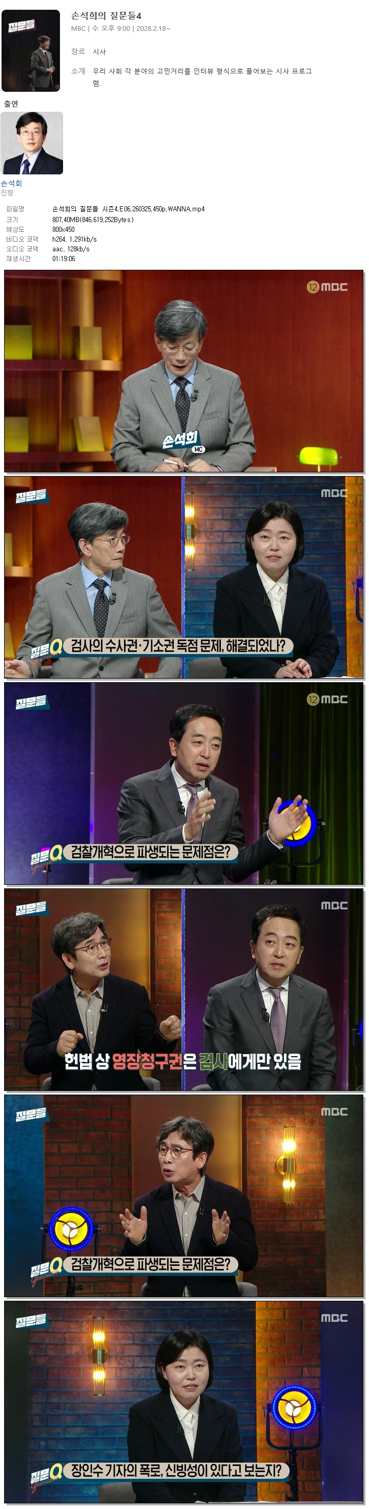 [MBC] 손석희의 질문들 시즌4.E06.260325.450p.WANNA[유시민, 임은정].mp4 807.4 M MP4 01:19:06 800x450