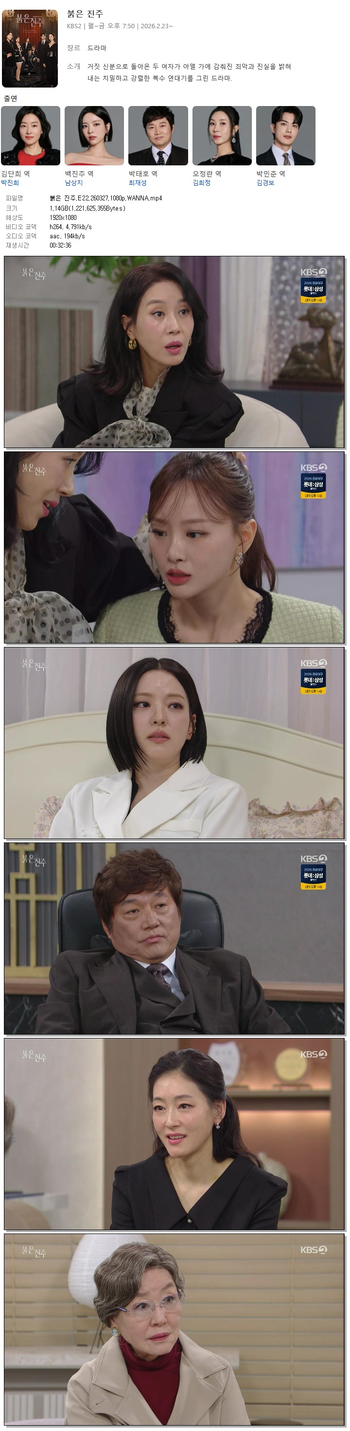 [KBS2] 붉은 진주.E22.260327.1080p.WANNA[박진희, 남상지].mp4 1.1 G MP4 00:32:36 1920x1080