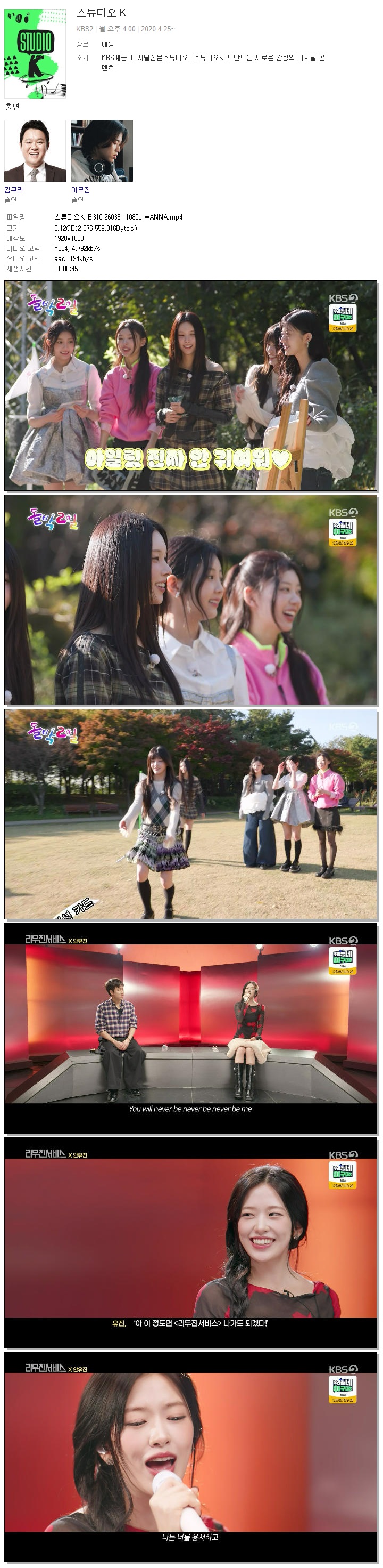 [KBS2] 스튜디오K.E310.260331.1080p.WANNA.mp4 2.1 G MP4 01:00:45 1920x1080