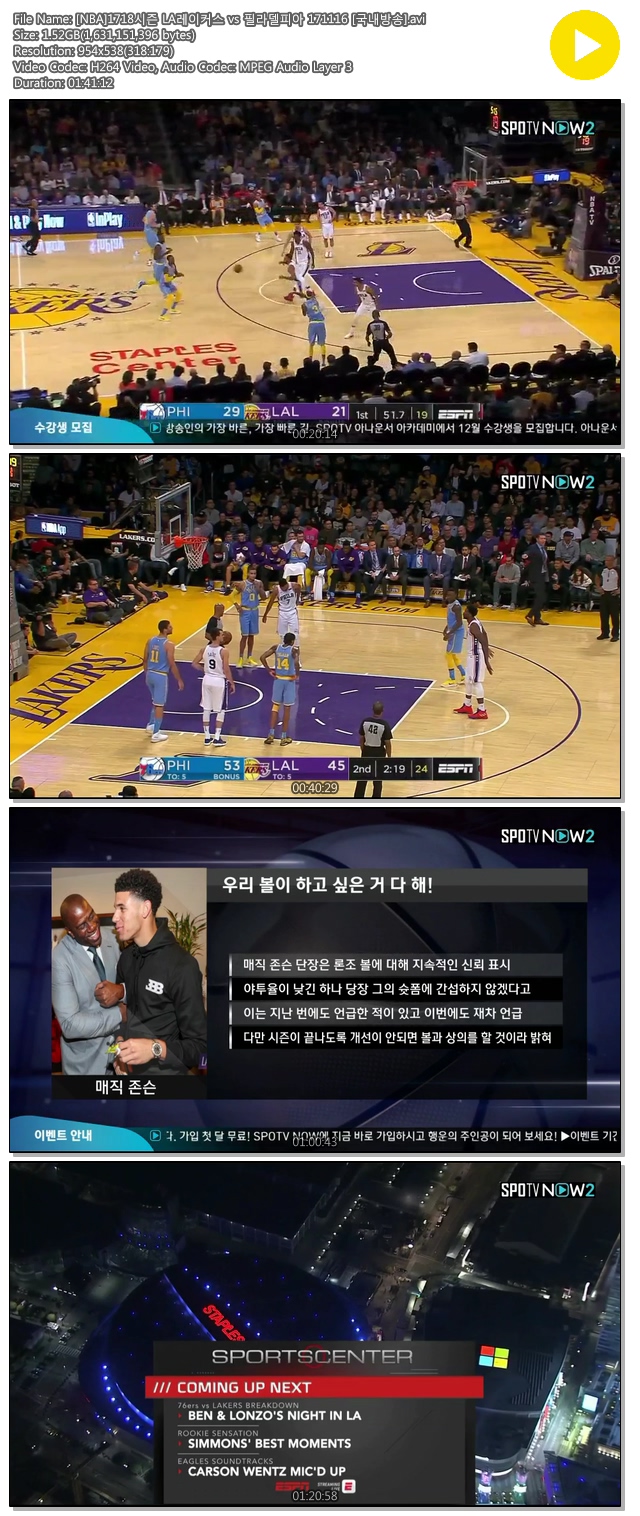 [NBA]1718시즌 LA레이커스 vs 필라델피아 171116 [국내방송].avi