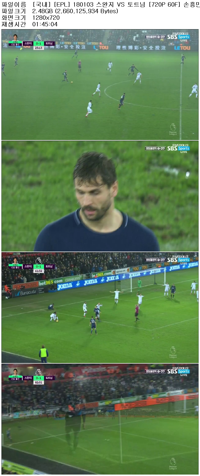 [국내] [EPL] 180103 스완지 VS 토트넘 [720P 60F] 손흥민.avi 2.5 G AVI 01:45:04 1280x720