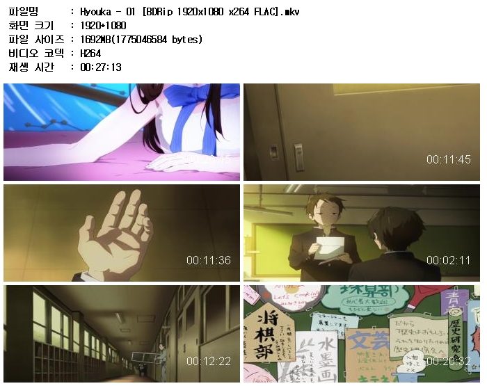 | Hyouka - 22(완) [BDRip 1920x1080 x264 FLAC].mkv | 1.5 G | MKV | 00:25:40 | 1920x1080 |