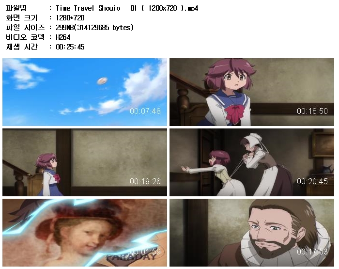 | Time Travel Shoujo - 01 ( 1280x720 ).mp4 | 299.6 M | MP4 | 00:25:45 | 1280x720 |