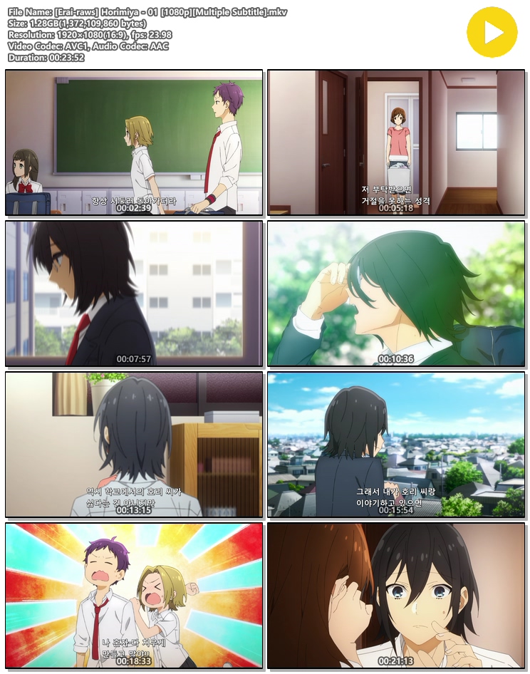 | [Erai-raws] Horimiya - 01 [1080p][Multiple Subtitle].mkv | 1.3 G | MKV | 00:23:52 | 1920x1080 |