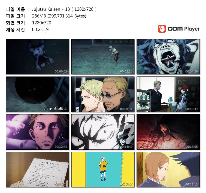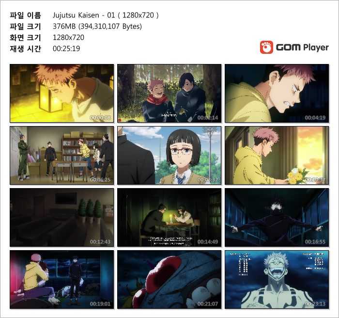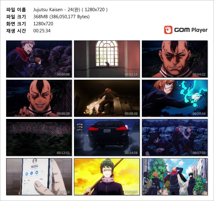 | Jujutsu Kaisen - 24(완) ( 1280x720 ).mp4 | 368.2 M | MP4 | 00:25:34 | 1280x720 |
