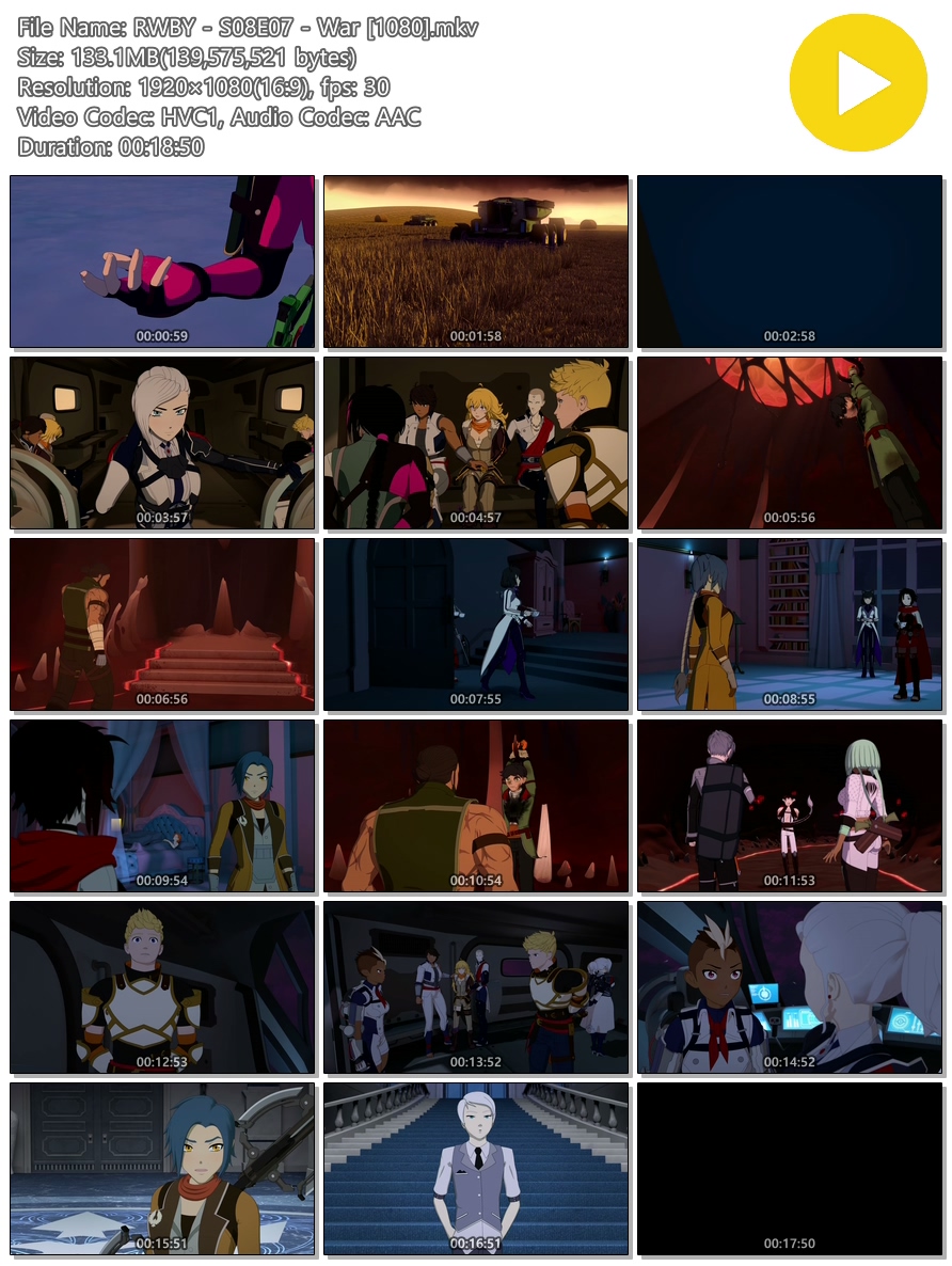 | RWBY - S08E07 - War [1080].mkv | 133.1 M | MKV | 00:18:50 | 1920x1080 |