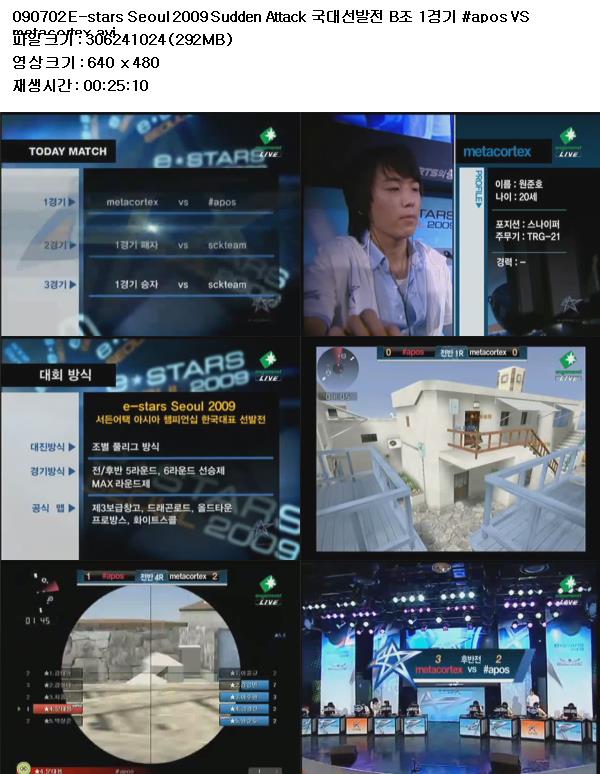 | 090702 E-stars Seoul 2009 Sudden Attack 국대선발전 B조 1경기 #apos VS metacortex.avi | 292.1 M | AVI | - | - |