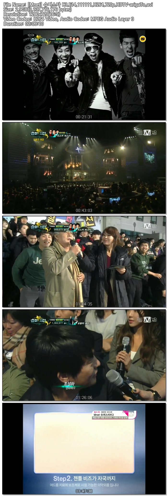 | [Mnet] 슈퍼스타 K3.E11.111021.H264.720p.HDTV-arigaTo.avi | 2.5 G | AVI | - | 1280x720 |