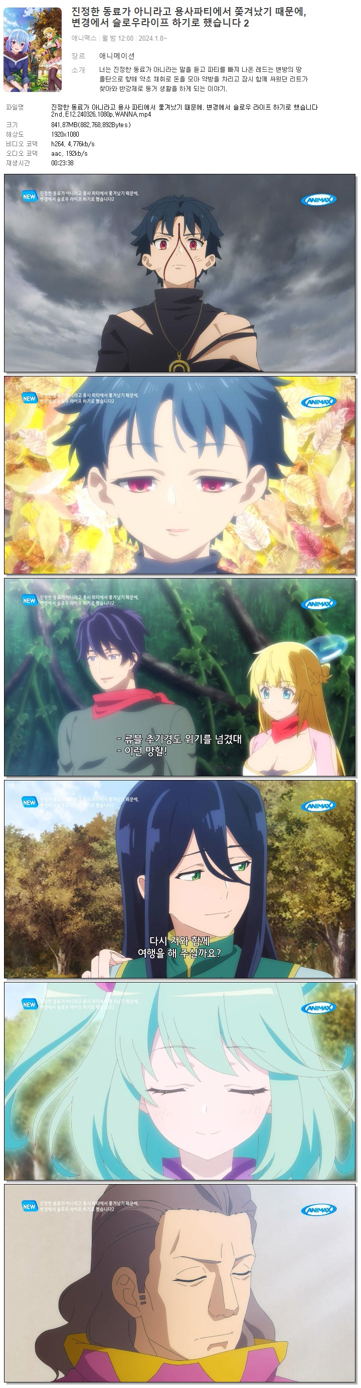 | 진정한 동료가 아니라고 용사 파티에서 쫓겨났기 때문에, 변경에서 슬로우 라이프 하기로 했습니다 2nd.E12.240326.1080p.WANNA.mp4 | 841.9 M | MP4 | 00:23:38 | 1920x1080 |