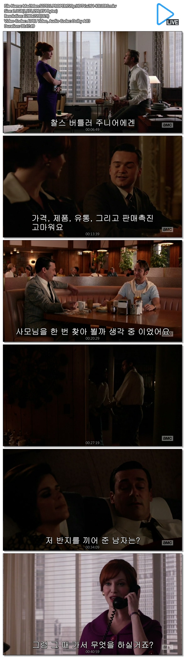 | Mad.Men.S07E01.PROPER.720p.HDTV.x264-KILLERS.mkv | 1.1 G | MKV | - | 1280x720 |