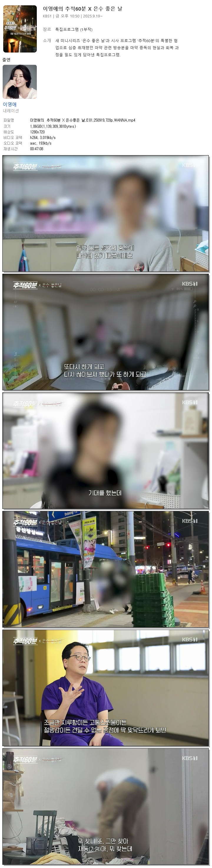 [KBS1] 이영애의 추적60분 X 은수좋은 날.E01.250919.720p.WANNA.mp4 1.1 G MP4 00:47:08 1280x720