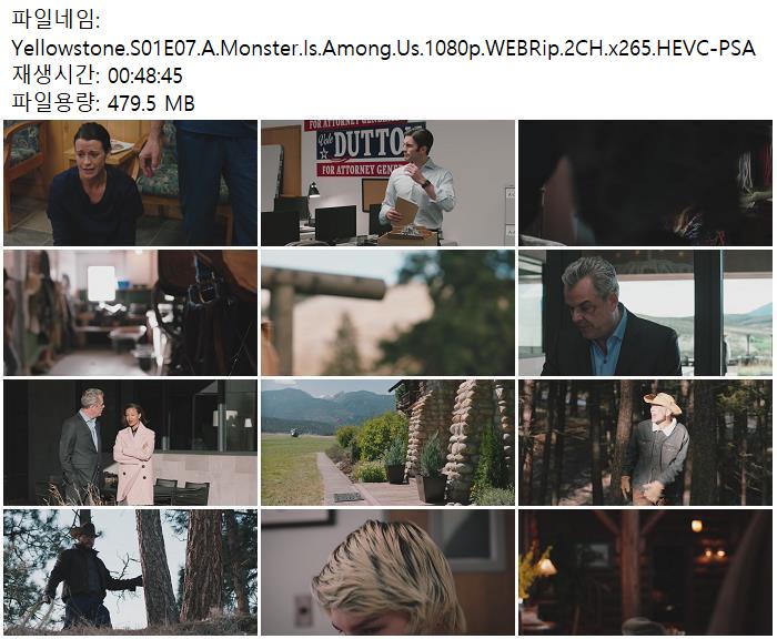 | Yellowstone.S01E07.A.Monster.Is.Among.Us.1080p.WEBRip.2CH.x265.HEVC-PSA.mp4 | 479.5 M | MP4 | 00:48:45 | 1920x1080 |