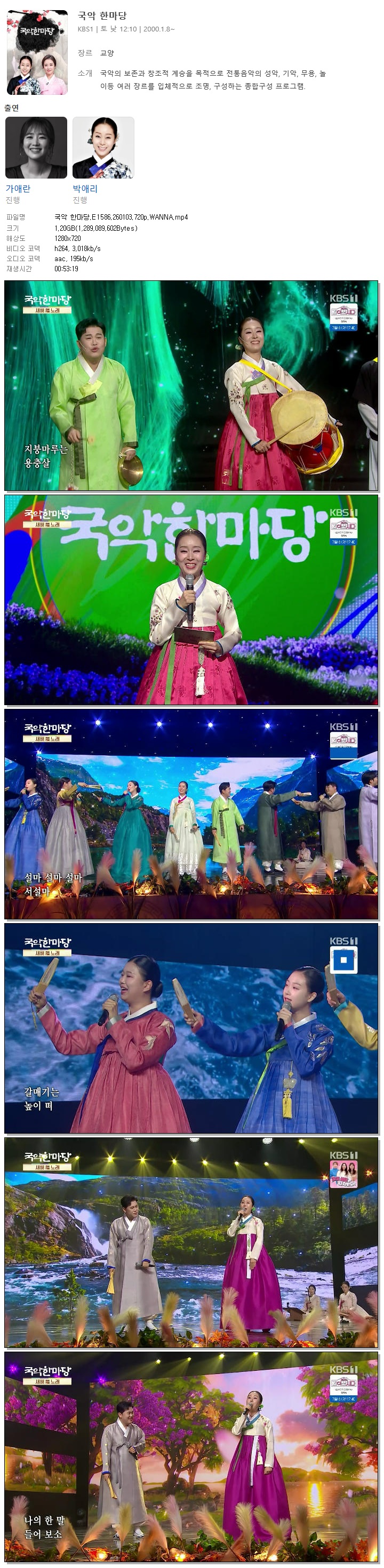 [KBS1] 국악 한마당.E1586.260103.720p.WANNA[박애리].mp4 1.2 G MP4 00:53:19 1280x720