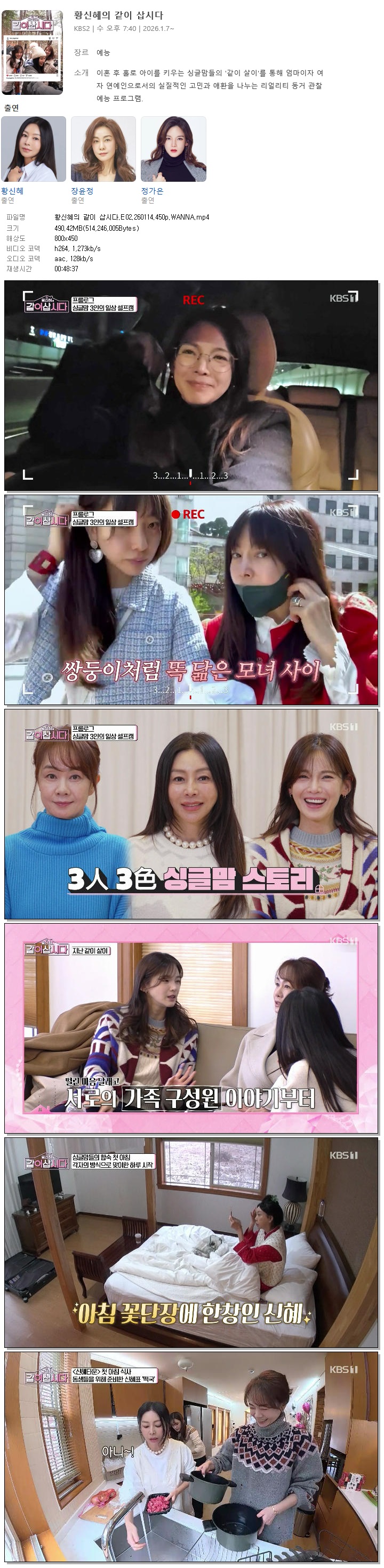 [KBS1] 황신혜의 같이 삽시다.E02.260114.450p.WANNA[황신혜, 정가은].mp4 490.4 M MP4 00:48:37 800x450
