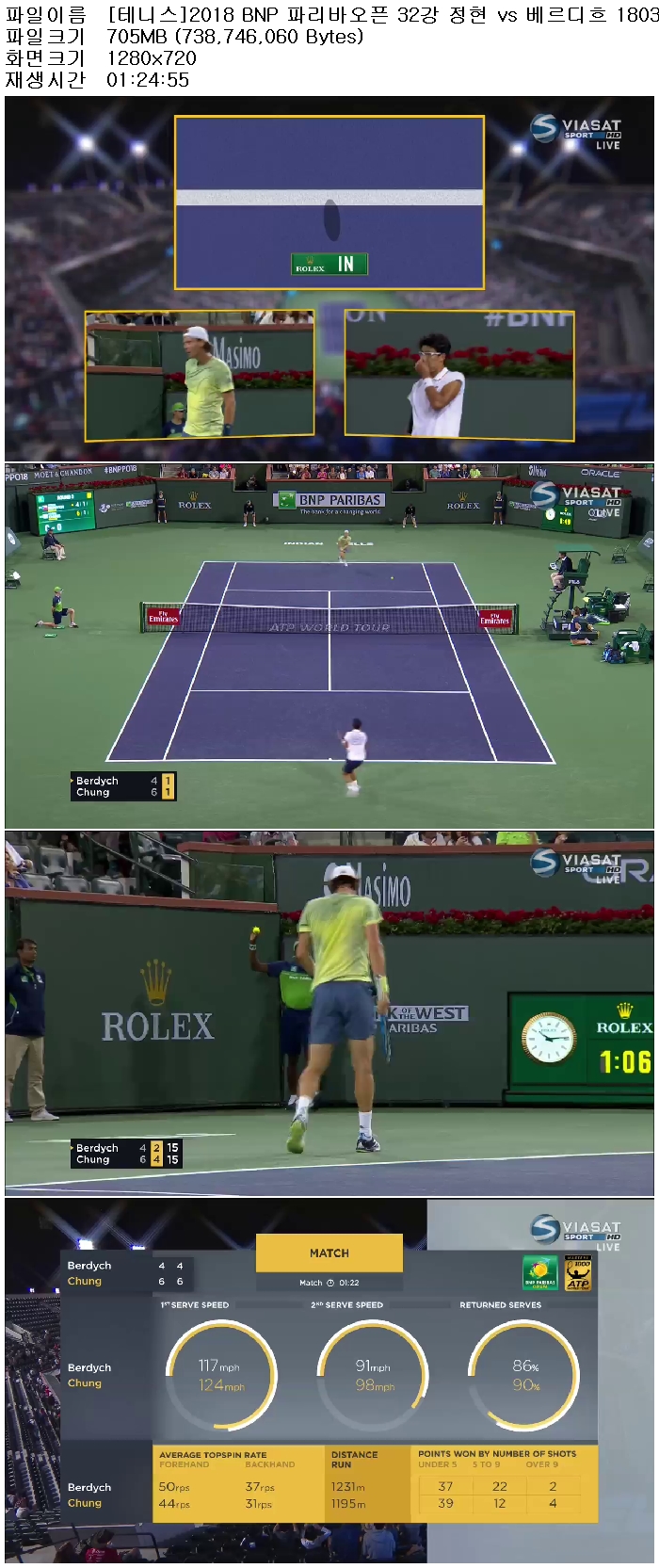 [테니스]2018 BNP 파리바오픈 32강 정현 vs 베르디흐 180313 [영어해설,고화질,720P].avi 704.5 M AVI 01:24:55 1280x720
