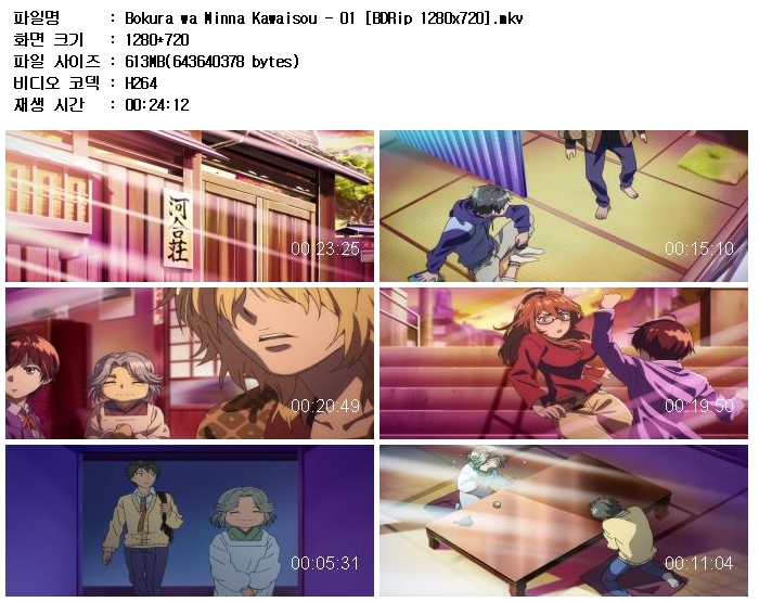 | Bokura wa Minna Kawaisou - 01 [BDRip 1280x720].mkv | 613.8 M | MKV | 00:24:12 | 1280x720 |