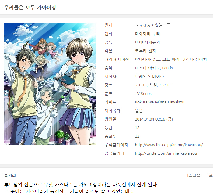 | Bokura wa Minna Kawaisou - 12(완) [BDRip 1280x720].mkv | 565 M | MKV | 00:24:12 | 1280x720 |