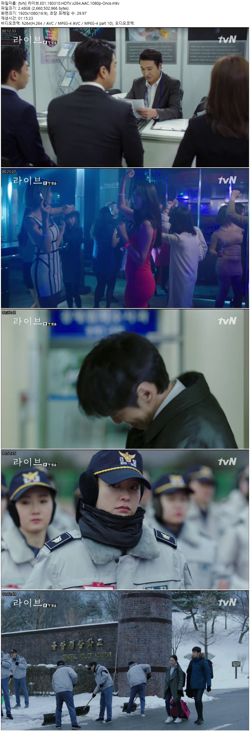 | [tvN] 라이브.E01.180310.HDTV.x264.AAC.1080p-Once.mkv | 2.5 G | MKV | 01:15:23 | 1920x1080 |