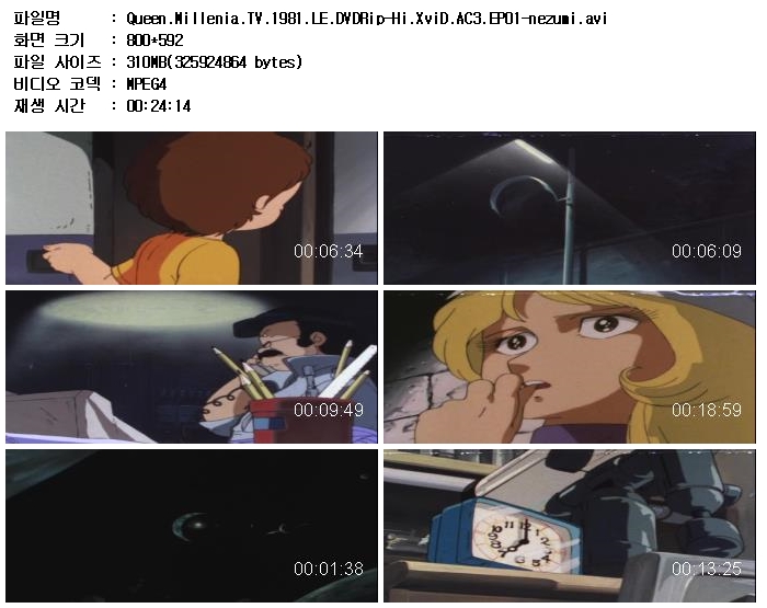 | Queen.Millenia.TV.1981.LE.DVDRip-Hi.XviD.AC3.EP09-nezumi.avi | 310.8 M | AVI | 00:24:14 | 800x592 |