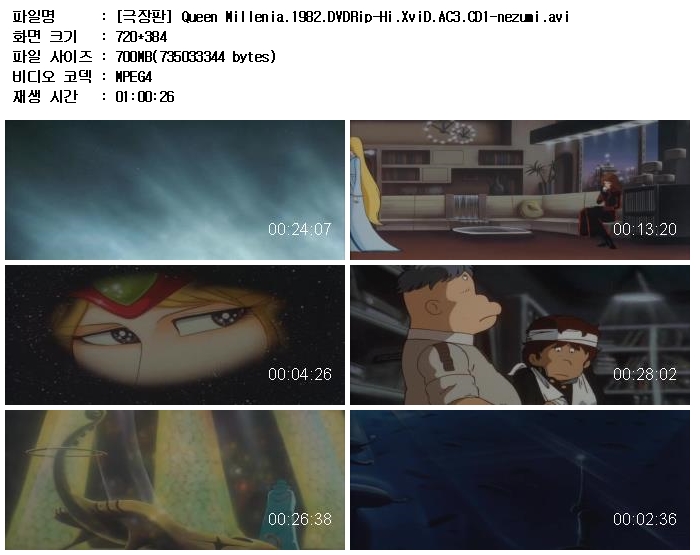 | [극장판] Queen Millenia.1982.DVDRip-Hi.XviD.AC3.CD2-nezumi.avi | 701 M | AVI | 01:00:20 | 720x384 |